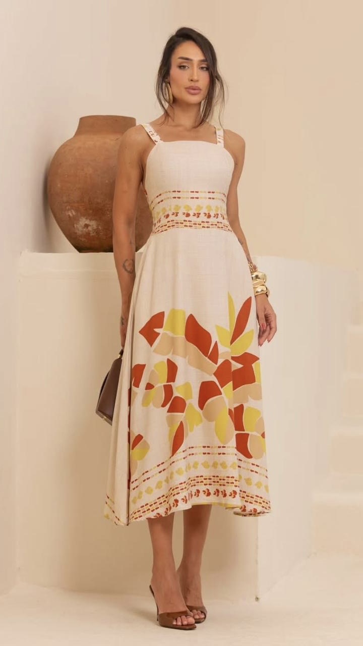 Com comprimento midi e estampas suaves, ele traz um visual romântico e atemporal. Os bolsos laterais garantem um toque funcional que faz toda a diferença no dia a dia.